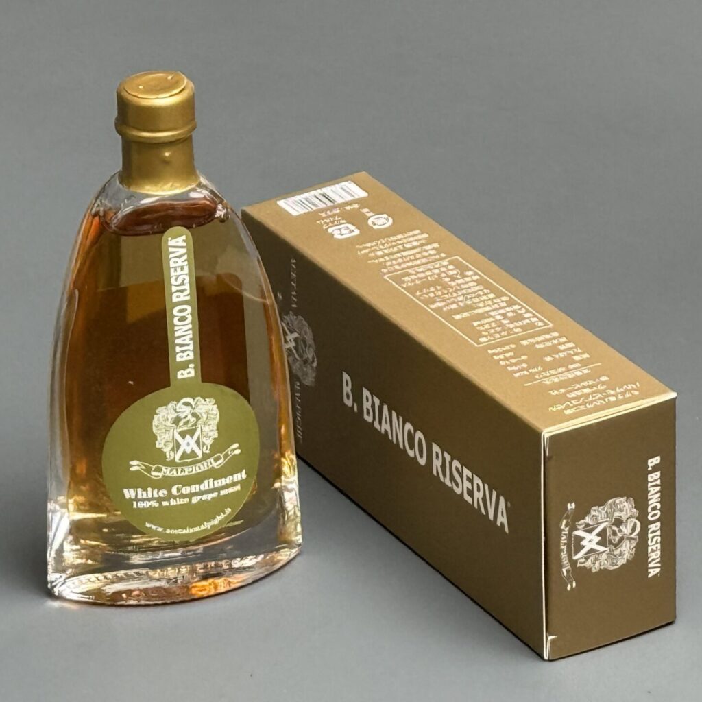 5年熟成のホワイトバルサミコ、バルサモ・ビアンコをさらに3年長く熟成させたバルサミコ。より酸味がおだやかになり、甘み、旨味がおいしく強調されています。塩味の強いチーズや果物と合わせたり、スムージーやアルコールに加えたりとさまざまな用途で活躍します。
