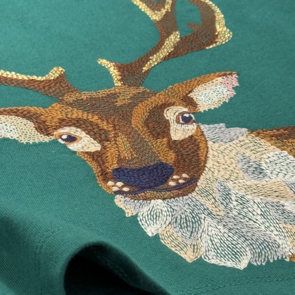 特に気に入っているのが、BODENの刺繍Tシャツである。例えば、クリスマスシーズンに選んだトナカイの刺繍Tシャツは、生地の厚みや発色が申し分ない。何より、刺繍が見事だ。トナカイの毛並みが、刺繍の濃淡や運針によって丁寧に表現されている。角の部分は金色の糸が使われていて、月光かなにかに照らされたまばゆさも感じられる仕上がりだ。